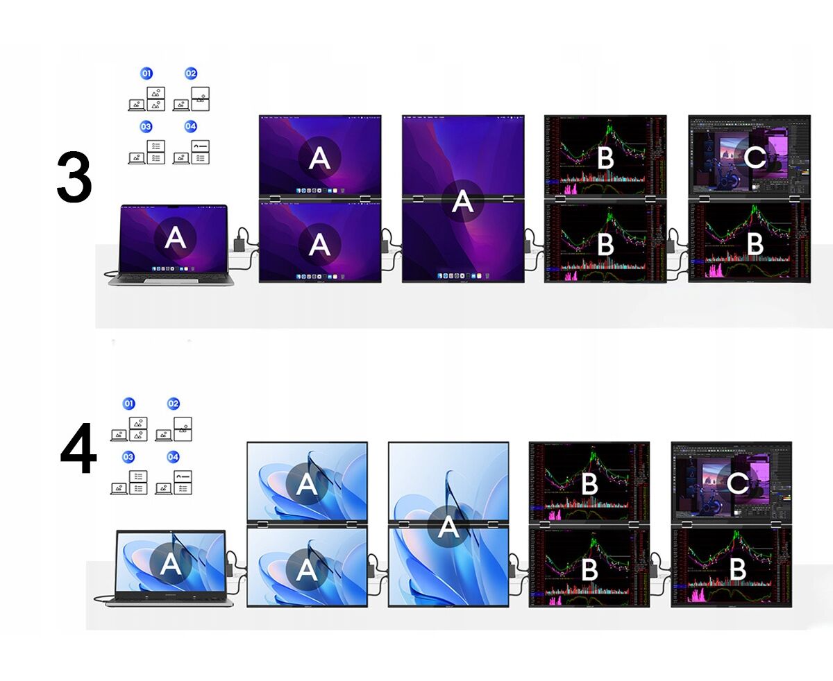 Zasilanie przez USB-C: Wygodne zasilanie monitorów bezpośrednio z laptopa lub zewnętrznego zasilacza (dla mniejszych obciążeń laptopa).