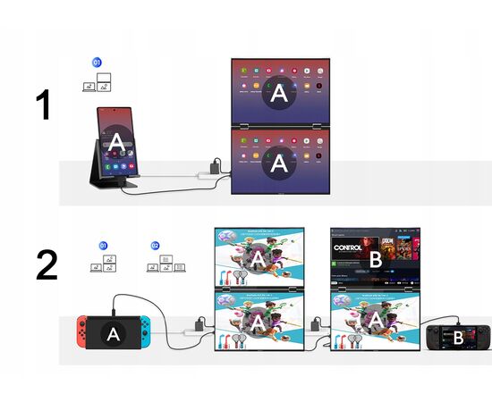 Tryb Duplikatu/Rozszerzenia: Używaj ekranów do rozszerzania biurka lub duplikowania obrazu, w zależności od potrzeb.